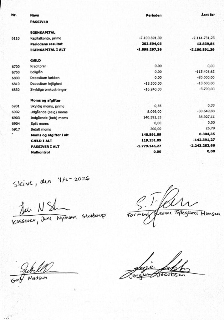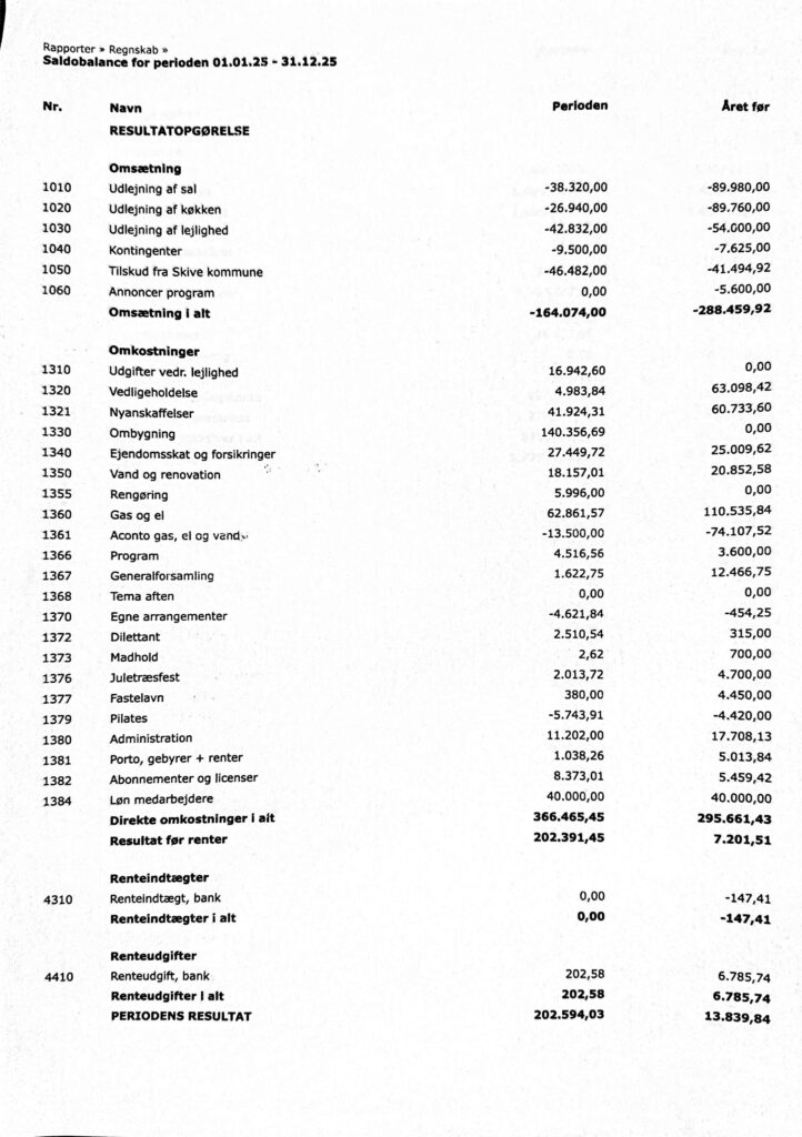 Regnskabet er i overensstemmelse med forsamlingshusets medlemmer, gjort offentligt tilgængeligt for gennemsyn i en periode på 14 dage fra dags dato, d. 4 februar 2026.